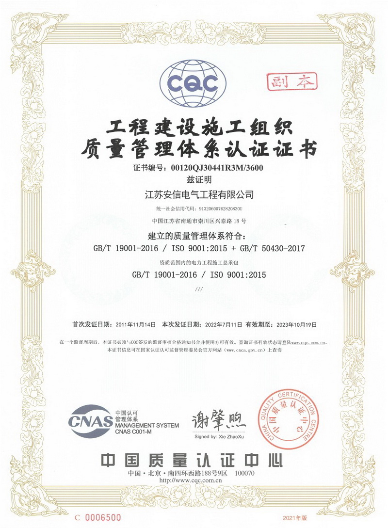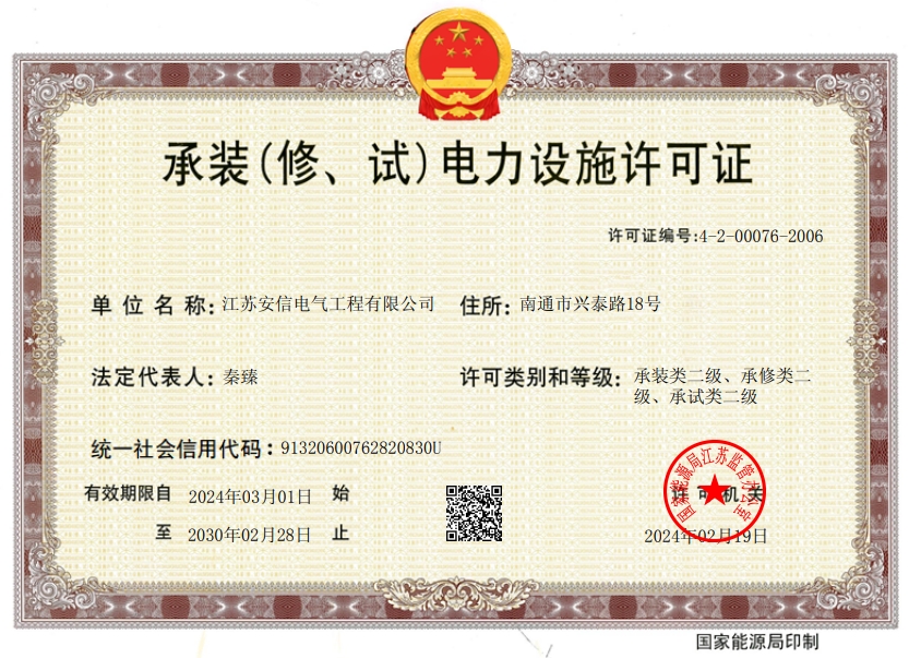 在創(chuàng)業(yè)之初,公司就堅(jiān)持高起點(diǎn)的戰(zhàn)略思路,廣納賢才,集聚行業(yè)精英,創(chuàng)新發(fā)展,做優(yōu)企業(yè)品牌。現(xiàn)已取得:承裝二級(jí)、承修二級(jí)、承試二級(jí),電力工程施工總承包二級(jí),輸變電工程專業(yè)承包二級(jí),建筑工程施工總承包二級(jí),建筑機(jī)電安裝專業(yè)承包二級(jí),地基基礎(chǔ)專業(yè)承包二級(jí)資質(zhì)證書(shū),并通過(guò)了質(zhì)量、環(huán)境、職業(yè)健康和安全管理體系認(rèn)證,確保各項(xiàng)工作有序管控。